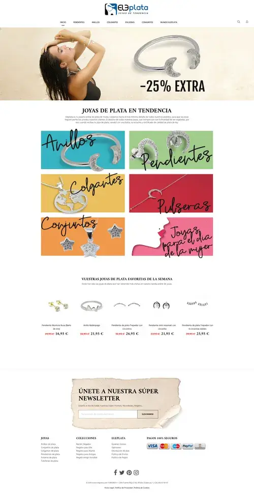 Diseño de una página web para una tienda de joyas de plata, orientada a mostrar productos y reforzar la imagen de marca. Web a medida, optimizada para SEO y pensada para mejorar la visibilidad y las ventas online.
