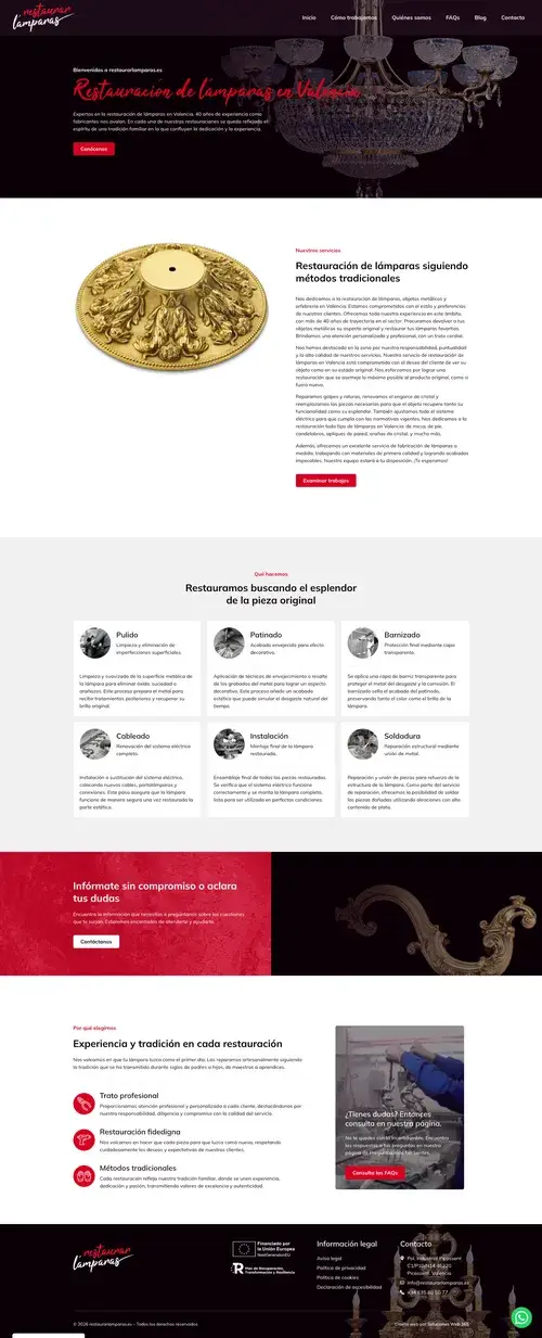 Desarrollo de una página web para un negocio especializado en la restauración de lámparas, enfocada a mostrar trabajos artesanales y servicios. Web a medida, optimizada para SEO y pensada para transmitir profesionalidad y confianza.